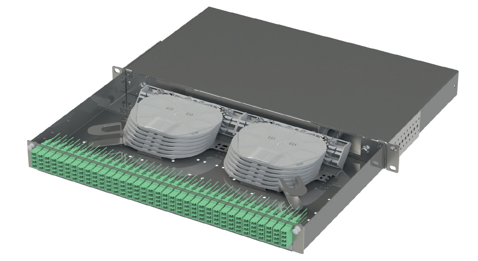 Durch ihre klar strukturierte Gliederung ist eine hochfaserige, sichere und schnelle Montage von Faserabschlüssen in einem 19″, 1HE großen Korpus möglich.