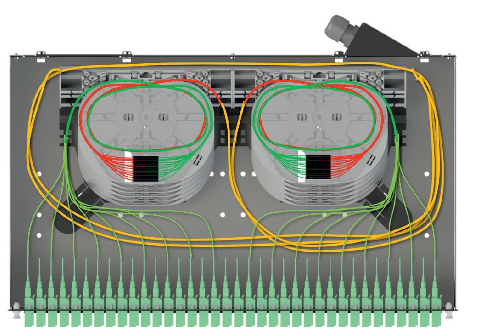 • Multifasermanagement durch Spleißkassettenblöcke mit integrierten Faserführungen oder Standard-Spleißkassetten