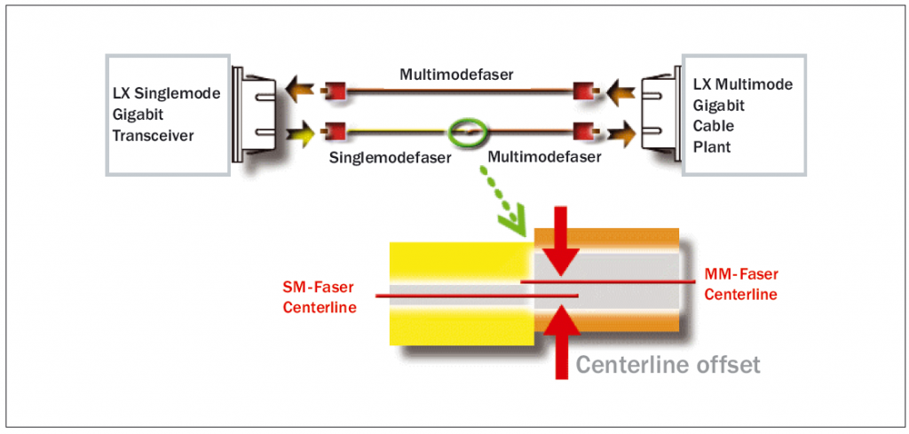 Modenkonditionierungskabel werden eingesetzt, um Probleme bei der Nutzung von Singlemode-Lasern bei der Übertragung über Multimodeglasfasern zu verhindern. Ihre Wirkung beruht darauf, höhere Moden anzuregen und damit Laufzeitunterschiede (Differential Mode Delay) zu begrenzen. Dies ge schieht durch die gezielt nach außerhalb des Zentrums des Kernes der Multimodefaser versetzte Einkopplung des Singlemode-Lasers.