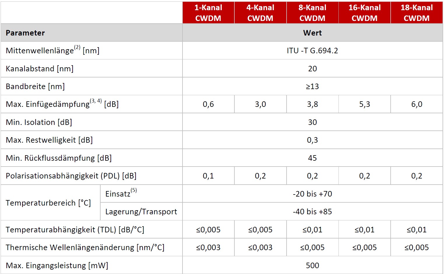 (3) Für ausgewählte Wellenlängenkonfigurationen sind niedrigere Werte verfügbar (4) Bei Raumtemperatur niedrigere Werte, genaue Werte bei Raumtemperatur auf Anfrage